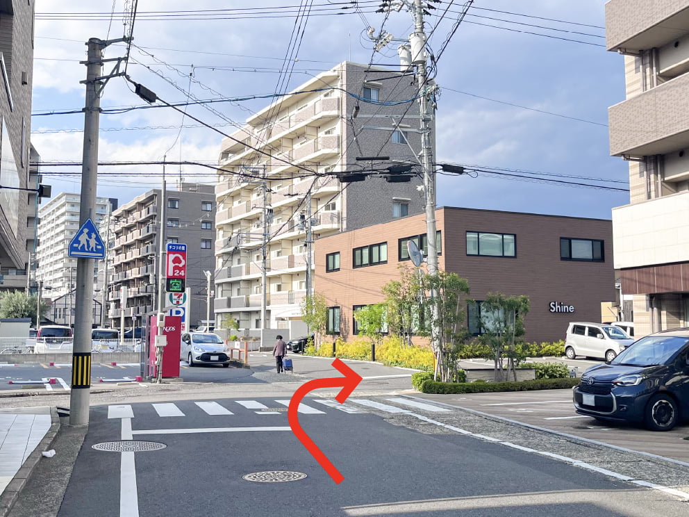 直進していくと、左手に「チコリの里」というパーキングやセブンイレブン、右手に「訪問看護ステーションかがやき」(壁面に”Shine”のマークがある建物)が見えてきますので、こちらを右折します。
