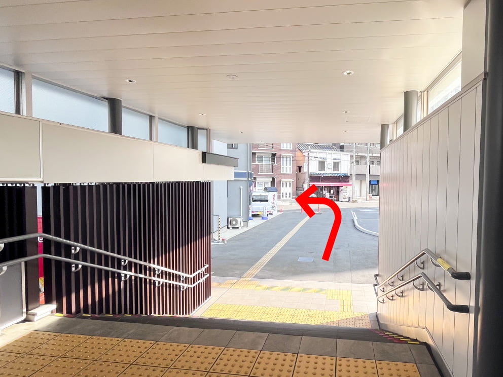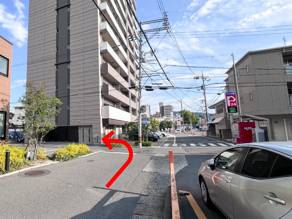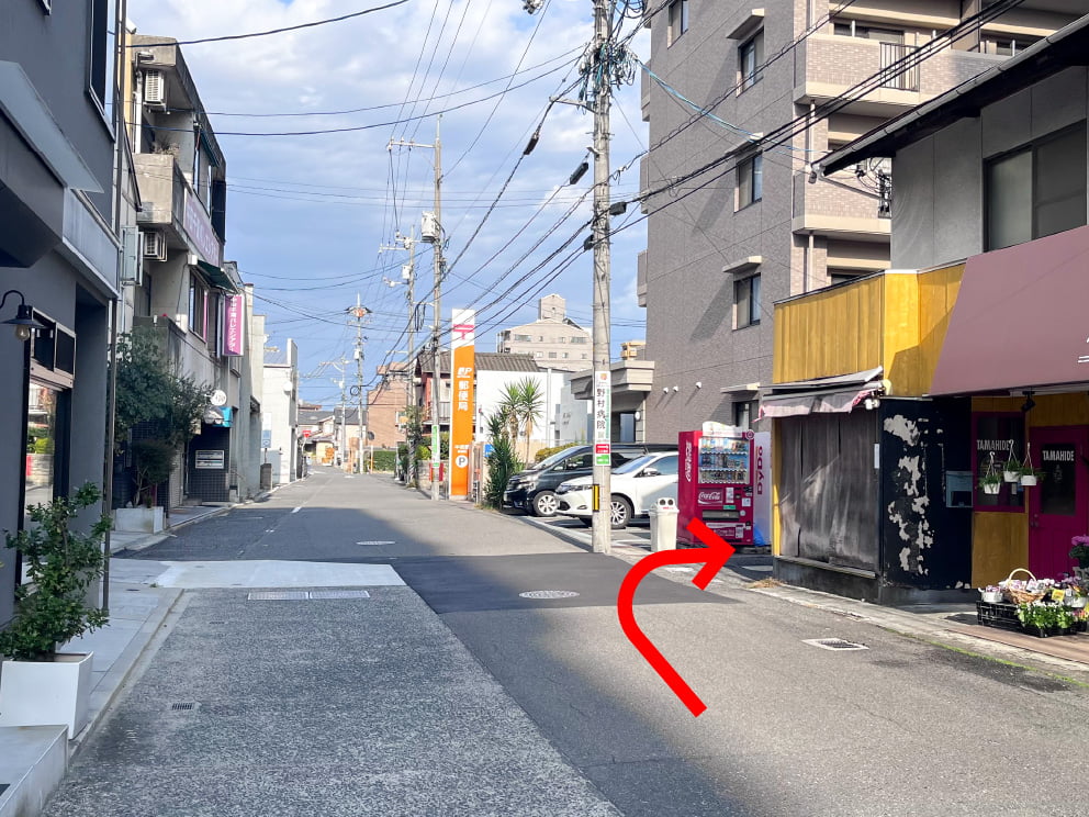 駅を出て左折後、すぐにコカコーラの自動販売機が見えてきますので、こちらを右折します。(右折後は道幅が狭くなっておりますので、ご注意ください。)