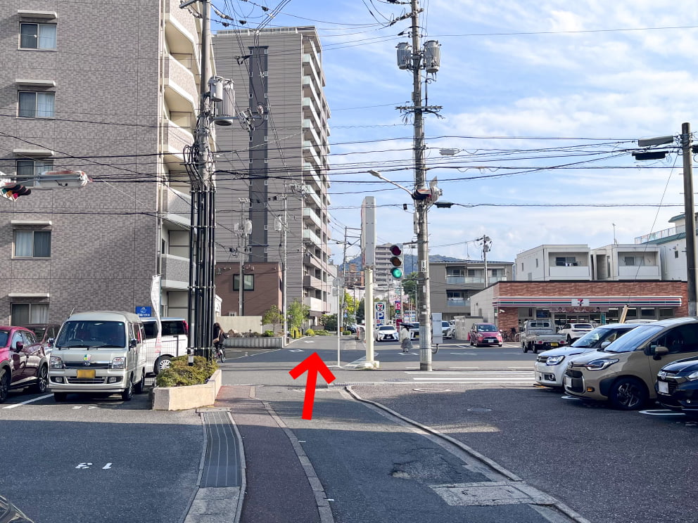 信号のある通りまで来ると、道路の正面右側にセブンイレブンが見えてきますので、その横の通りを直進します。