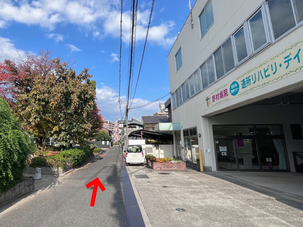 先ほどのパーキングを右折したら、しばらく直進します。右手には野村病院があります。こちらの病院や隣接の「通所リハビリ・デイサービスぎおん」を通り過ぎると、当院の案内看板が正面に見えてきます。