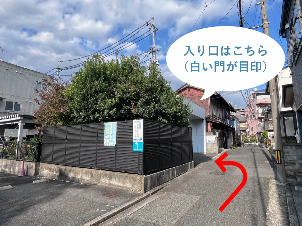 当院の案内看板の奥側に当院入り口がございます。白色の門が目印です。